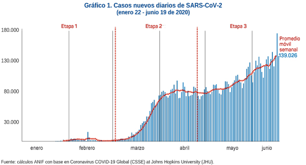 Hay un hecho indudable: la situación global no está empeorando debido a que el crecimiento en los contagios no es generalizado y se concentra en muy pocos países. La evolución reciente de la pandemia indica que los contagios crecen a una tasa menor. Así lo muestra la tasa compuesta de crecimiento diario, que en los primeros meses de la propagación (hasta abril) fue de 29%, mientras que en el periodo completo (enero-junio) la tasa es 19%, sustancialmente menor. Además, el crecimiento de los contagios se concentra en unos cuantos países. En efecto, durante el último mes Brasil, India, Estados Unidos y Perú aportaron la mitad de los casos nuevos en el mundo. Por último, las muertes están cayendo. El pico de las muertes ocurrió a mediados de abril y, desde ese momento, estamos en la etapa consistentemente decreciente. Esto se puede ver tanto en términos relativos con un indicador que construimos (muertes/promedio móvil, dos semanas de contagios) como en números absolutos de las muertes diarias.