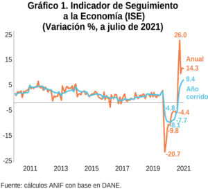 El DANE dio a conocer las cifras de PIB del segundo trimestre de 2021 el pasado martes 16 de agosto, mostrando el alcance del “rebote” de la actividad económica después de observar el peor registro en materia de crecimiento en la historia del país. Los resultados mostraron una variación anual del PIB real de 17.6%, en línea con las expectativas del mercado y los analistas. En efecto, las proyecciones más optimistas se encontraban cerca del 20% mientras que las más pesimistas estaban ligeramente por encima de 14%. Con todo, los resultados en materia de valor agregado son positivos para el segundo trimestre del año. No obstante, los datos indican que el crecimiento de la economía habría sido mayor de no ser por las marchas y bloqueos en el marco del paro nacional, que afectaron el aparato productivo del país durante el mes de mayo y gran parte del mes de junio.