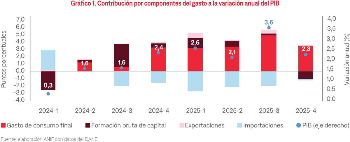 - El PIB creció 2,3% anual en el cuarto trimestre, por debajo del rango esperado por el mercado (2,8%–3,0%).