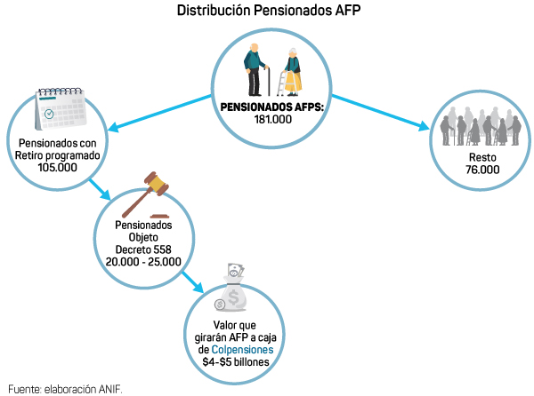 Como parte de las medidas para enfrentar el impacto de la propagación del SARS-CoV-2, el Gobierno Nacional expidió el Decreto 558 de 2020 que alivia durante dos meses el pago de las cotizaciones al Sistema General de Pensiones, manteniendo el aporte del 3% destinado al seguro previsional y los costos administrativos de Colpensiones y las AFP. Adicionalmente, el Decreto dispuso que aquellos pensionados en la modalidad de Retiro Programado, que se han visto afectados en sus cuentas de ahorro pensional por la propagación del SARS-CoV-2, se trasladen obligatoriamente a Colpensiones y que las AFP giren todos sus ahorros, equivalentes a 0.4% y 0.5% del PIB, para que continúen recibiendo una pensión mínima en la modalidad de Renta Vitalicia. Esta decisión le permitirá a Colpensiones contar con recursos para continuar atendiendo los pagos mensuales que realiza a los pensionados del RPM, compensando los menores ingresos que se presume dejará de recibir por la suspensión de aportes en los próximos dos meses y, además, disponer de mayores recursos para atender programas como Colombia Mayor.