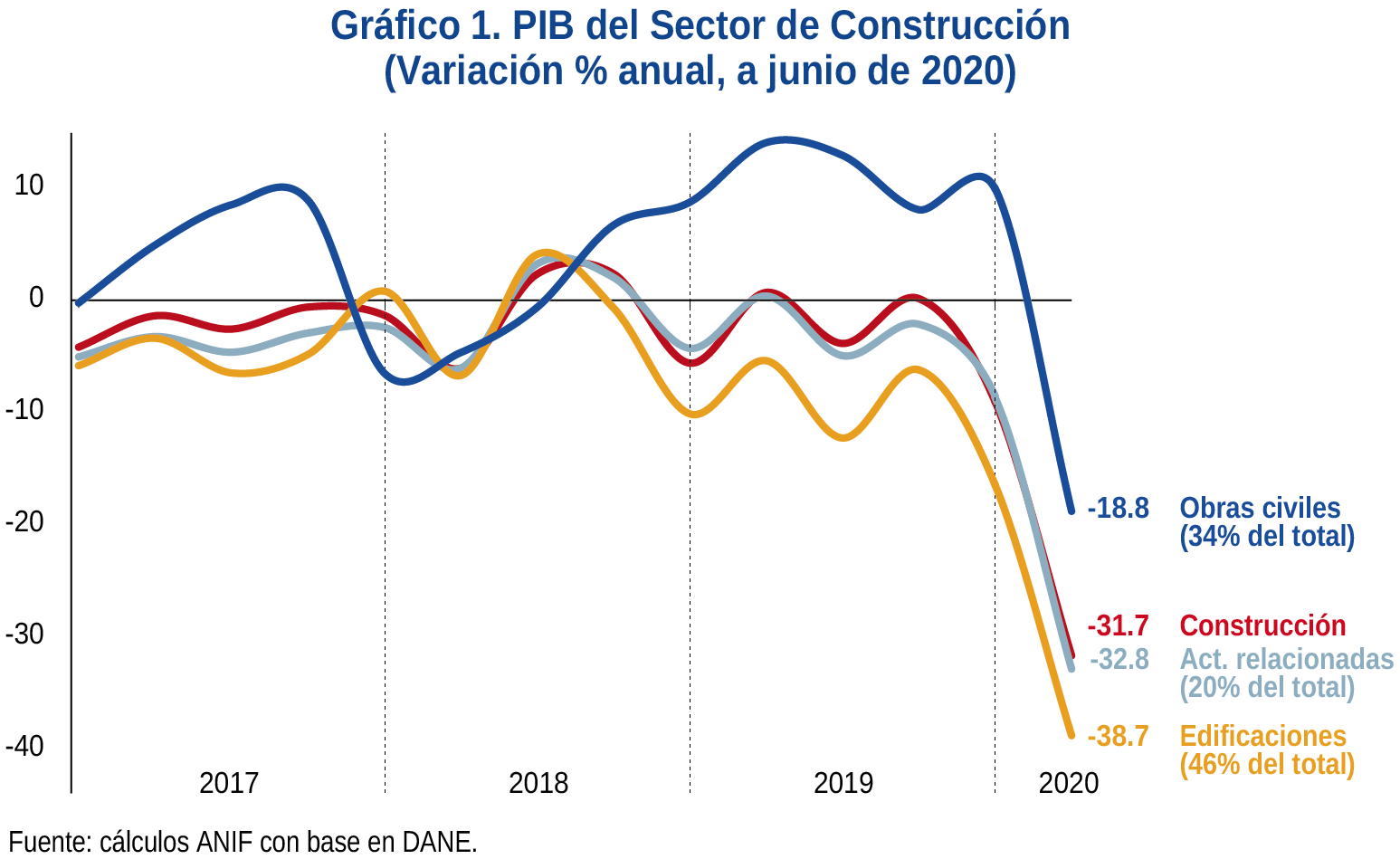 Debido al panorama que se generó a causa de las medidas para contener el virus SARS-CoV-2, la situación económica del país es compleja, así lo indican los marcados deterioros en la mayoría de sectores económicos. En particular, los peores resultados se observaron en aquellos sectores que difícilmente operan bajo esquemas de teletrabajo o que requieren aglomeración de personas para su funcionamiento, como fue el caso de: (i) comercio, transporte y turismo (con variaciones en el PIB de -16.5% anual en enero-junio de 2020 vs. 3.9% un año atrás); (ii) actividades de recreación (-20.1% vs. 3.8%); y (iii) construcción (-21% vs. -2.3%).