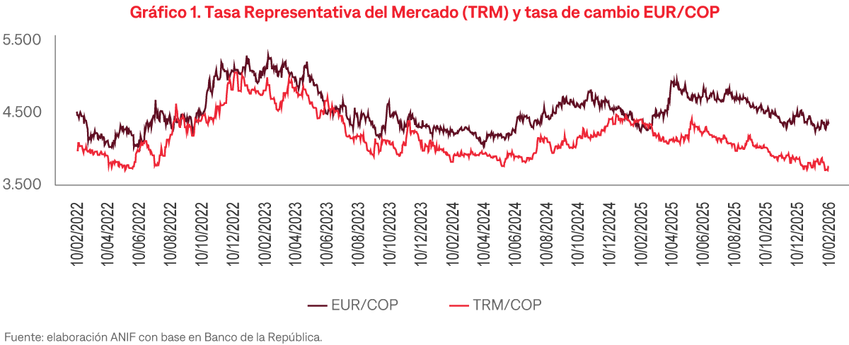 - La apreciación del peso colombiano durante 2025 y en lo corrido del 2026 responde principalmente al debilitamiento global del dólar, impulsado por el manejo de la política monetaria en Estados Unidos y una mayor incertidumbre en la política comercial.