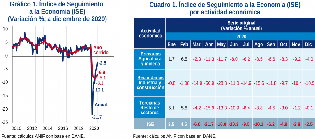 Sin embargo, no podemos dejar de hacer referencia a lo que para muchos fue una sorpresa, la caída del PIB fue menor a lo esperado por la mayoría de los analistas, públicos y privados. No lo fue para nosotros, pues tal como proyectamos en nuestra última revisión de escenarios a principios de año, divulgada en nuestro Comentario Económico del Día del 21 de enero y en Panorama ANIF, la contracción estuvo en el orden de 6.8% para todo el 2020, lejos de quienes estimaban valores incluso cercanos a -10%.