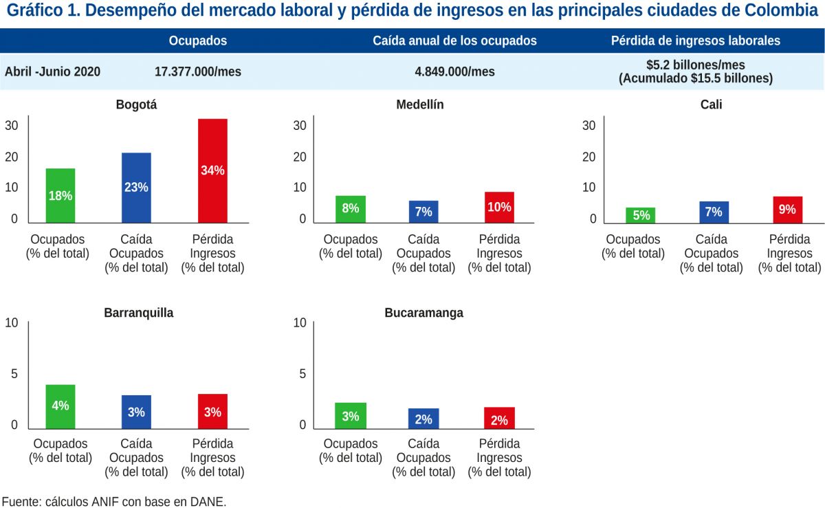 La estrategia de la Administración Distrital de Bogotá para la contención del virus ha tenido el mayor costo económico en el país sin que los resultados en salud sean favorables. Todo lo contrario, junto con Barranquilla, Bogotá fue la ciudad con mayor aceleración de contagios y muertes durante julio. La diferencia radica en que los resultados de los indicadores económicos son mucho peores para la capital, con una mayor pérdida de empleo, caída de ingresos de los hogares, reducción de la producción industrial y contracción del comercio minorista. Esto es particularmente grave debido a la importancia económica de la ciudad en términos de empleos y PIB. Hacemos un llamado fuerte para que la Administración Distrital revise su enfoque basado en cuarentenas hacia el futuro. El daño ya ha sido sustancial.