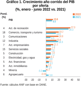 El 16 de agosto el DANE publicó las cifras del Producto Interno Bruto (PIB) para el segundo trimestre del año. En esta ocasión la economía se expandió 12.6% en línea con las proyecciones de ANIF para el trimestre (12 – 12.6%). Con eso, la primera mitad del año registra un crecimiento de 10.6%, dato que supera el 9.0% observado en el mismo periodo de 2021.
