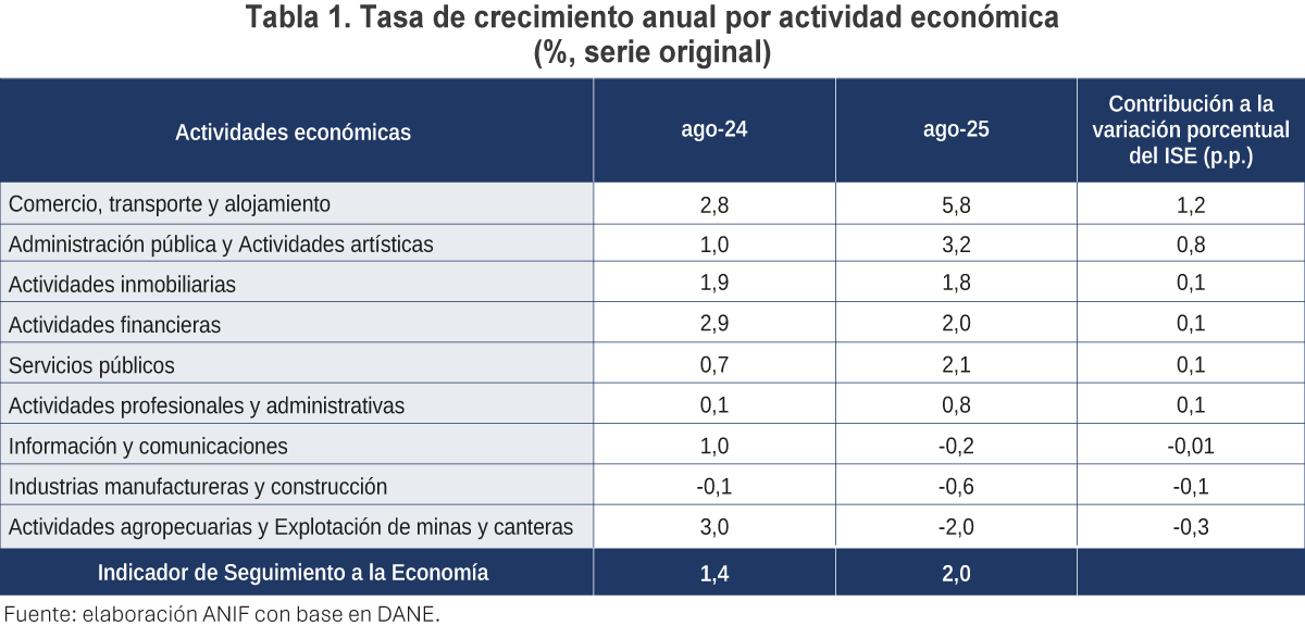 - La economía creció 2,0% anual en el mes de agosto, comportamiento superior al 1,4% observado en el mismo periodo del año anterior. En lo corrido del año se registra un crecimiento de 2,6%.
