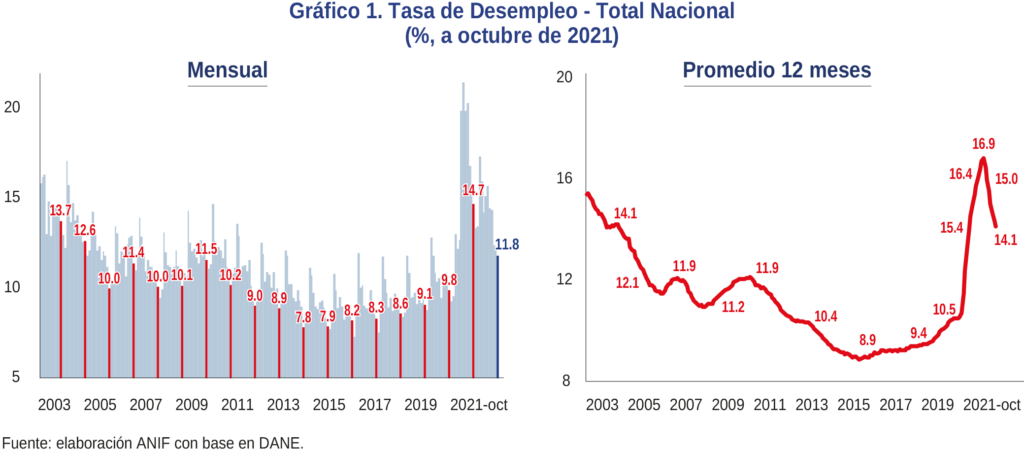 En octubre subió por primera vez el registro anual de la TD desestacionalizada desde abril de este año, motivo por el cual se podría pensar en un estancamiento en la recuperación del empleo en los últimos meses del año. Es importante continuar con la senda de recuperación del desmempleo en lo que queda de 2021 y evitar que crezcan las asimetrías entre el crecimiento de la economía y el empleo como se ha visto la mayor parte de este año.