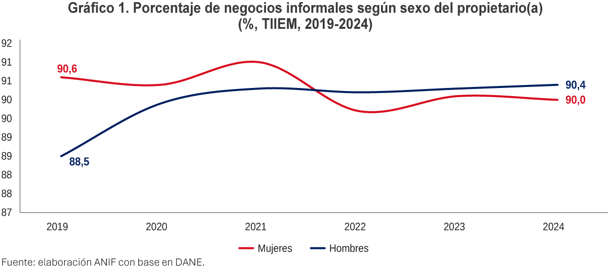• En 2019, los micronegocios de mujeres eran más informales (90,6% vs 88,5% hombres), pero desde 2022 la situación se invierte: en 2024 los de hombres superan a los de mujeres por 0,4 puntos porcentuales (pp).