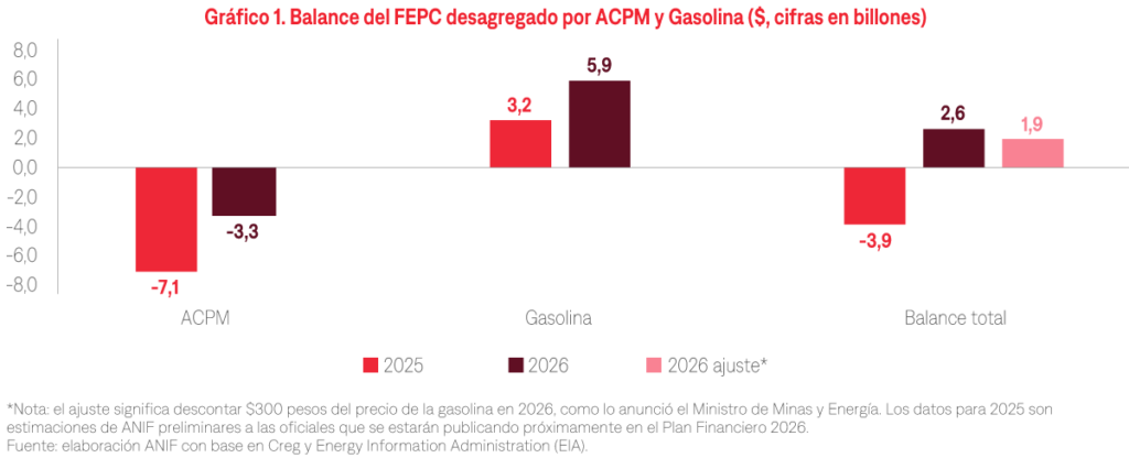 - El balance del FEPC pasaría de $2,6 billones de pesos proyectados en 2026 a $1,9 billones con el ajuste, una diferencia de $659 mil millones de pesos, dejando poco espacio para absorber la volatilidad en la tasa de cambio, y que, en caso de depreciarse, encarecería las importaciones de combustible.
