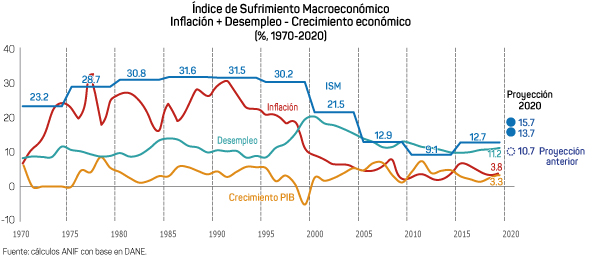 Nuestros pronósticos sugieren que el Índice de Sufrimiento Macroeconómico (ISM) estaría ascendiendo hacia valores en el rango 13.9%-15.7% al cierre de 2020 (por encima del registro del último quinquenio de 12.7%). Debido al “frenazo en seco” que está teniendo la economía colombiana por el Aislamiento Preventivo Obligatorio para prevenir la propagación del SARS-Cov2, decretado por el Presidente de la República hasta el 13 de abril, pronosticamos un impacto desfavorable sobre la demanda agregada, lo cual significa menores ritmos de crecimiento económico. En efecto, ANIF proyecta un crecimiento del PIB en el rango 1.8% y 2% para 2020 (escenario base), lo que estará sujeto a la duración del “frenazo” y esperamos alguna recuperación durante la segunda mitad del año. En caso de persistir la crisis de salud pública, el escenario macroeconómico del país podría ser más complejo, con una desaceleración del PIB hacia el rango 0.5% y 1%. En todo caso, los resultados que se obtendrán en este año serán mucho mejores que los registrados en las décadas 1970s y 1980s. Los avances del ISM son notables y nos muestran que estamos en otro nivel y que la economía colombiana ha tenido una mejoría notable en los últimos 20 años.