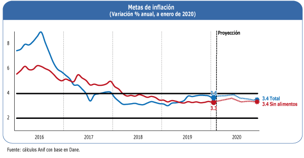 El Dane reportó que el mes de enero de 2020 registró una inflación mensual del +0.42%. Ello implicó descensos en la lectura de inflación anual hacia el 3.6% (vs. 3.8% un mes atrás), debiendo el Banco de la República (BR) monitorear la continuación de esa convergencia inflacionaria durante 2020 hacia la meta de largo plazo. Este año inicia con perspectivas de estancamiento en el crecimiento global en niveles del 3% (incluso con sesgos bajistas por cuenta de los daños del coronavirus sobre la economía de China y sus efectos en las cadenas de valor global). A nivel local, Anif mantiene su proyección de leve aceleración de la economía colombiana hacia ritmos del 3.3% en 2020. Teniendo en cuenta todo lo anterior, en opinión de Anif, la convergencia inflacionaria al 3.4% anual en 2020 es consistente con una repo inalterada en sus actuales niveles del 4.25% durante todo el año, donde no vemos espacio para reducciones. A pesar del buen dato de enero se deberán continuar monitoreando i) la corrección en los choques de oferta en los alimentos; ii) los potenciales depass-through cambiario, en función del contagio que pueda experimentar Colombia ante la volatilidad externa; y iii) los posibles expedientes de inercia inflacionaria ante el incremento del SML del 6%.