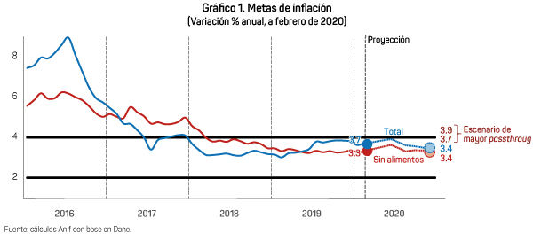 El panorama de alta volatilidad global sugiere mayores dificultades para lograr una convergencia inflacionaria en Colombia hacia niveles del 3.4% anual en 2020, como lo pronosticábamos al inicio del año. Habrá que monitorear: (i) el comportamiento de los precios de los alimentos luego de los choques de oferta de inicios de 2020; y (ii) la magnitud del pass-through cambiario, en función del contagio que pueda experimentar el país ante esa volatilidad externa (donde la devaluación promedio peso-dólar podría alcanzar niveles cercanos al 10%). Como hemos manifestado, esto podría ubicar la inflación total entre 3.7%-3.9%, acercándose al techo del rango meta del Banco de la República (BR). En cuanto a las futuras decisiones del BR para contener los efectos del COVID-19 en la economía, consideramos que sería factible un escenario en el que se implementen medidas de apoyo a los pequeños negocios y a los sectores más afectados por la epidemia, como las operaciones de financiación a largo plazo con objetivo específico que anunció el Banco Central Europeo o el esquema de financiamiento con incentivos a las pequeñas y medianas empresas del Banco de Inglaterra.