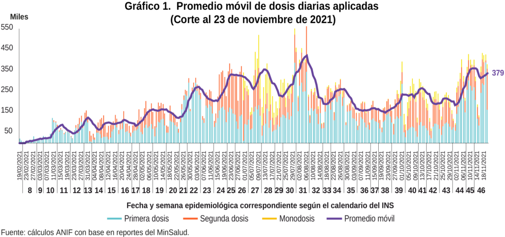En la última semana, el Plan Nacional de Vacunación (PNV) ha recuperado el ritmo de aplicación de vacunas, panorama que deja al país en una posición favorable para consolidar la recta final del PNV en el último mes del año. Como muestra el Gráfico 1, la semana 46 arrojó un promedio móvil de 379.967 dosis aplicadas diarias, comparable, de hecho, con los mejores promedios diarios desde que inició el PNV. Según el gráfico, se observa que en las 3 primeras semanas del mes de noviembre hubo una caída relevante en el promedio de aplicación de dosis diarias. Sin embargo, gracias al esfuerzo del Ministerio de Salud y Protección Social (MinSalud) en la última semana, el promedio logró recuperarse y se consolidó un gran avance en el ritmo de aplicación de vacunas.