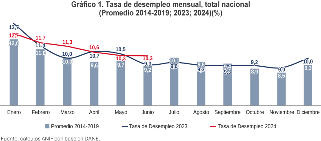 - La tasa de desempleo en junio de 2024 fue de 10,3%, lo que representó un aumento de 1,0 puntos porcentuales respecto a junio de 2023. En términos desestacionalizados, la tasa de desempleo se ubicó en 10,7%, 0,3 puntos porcentuales superior a junio de 2023 (10,4%). Es la primera subida registrada en este indicador desde marzo de este año.