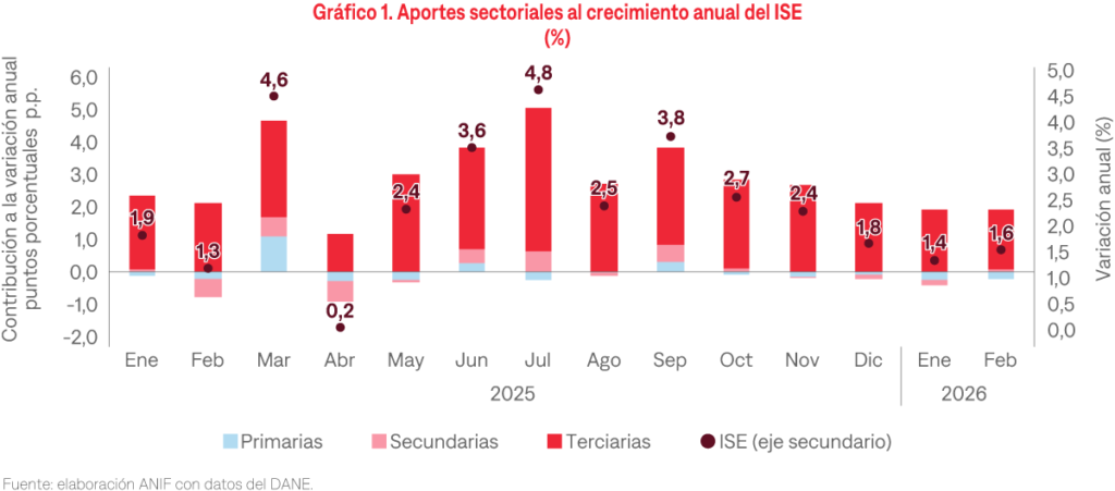 - La actividad económica creció 1,6% anual en febrero, impulsada principalmente por las actividades terciarias.