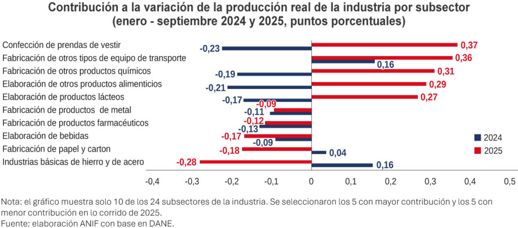 - En lo corrido del año, los subsectores de la industria que más han contribuido en puntos porcentuales a la recuperación del sector han sido: Confección de prendas de vestir (0,37), fabricación de equipos de transporte (0,36), y otros productos químicos (0,31).