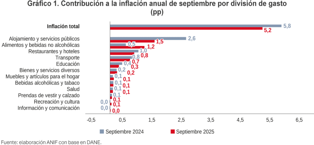 - En septiembre, la inflación mensual fue de 0,32%, donde alojamiento y servicios públicos (0,1 puntos porcentuales), educación (0,06 puntos porcentuales) e información y comunicación (0,04 puntos porcentuales) fueron las divisiones que más contribuyeron a la variación mensual.