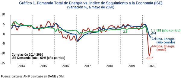 Al analizar la información para el sector no regulado (empresarial) encontramos que en mayo hubo una mejoría en comparación con abril. Si bien el crecimiento anual es todavía negativo, se empieza a ver los resultados de la reactivación de algunos sectores, todo esto a pesar de que no hubo una coordinación completa con ciudades grandes como Bogotá. Debido a que la demanda de energía es un indicador líder del sector industrial, podríamos esperar que los resultados de mayo sean mejores al registro de abril. Por esa razón, no nos cansamos de insistir en que debemos reactivar los sectores que sean posibles de abrir en el menor tiempo posible.