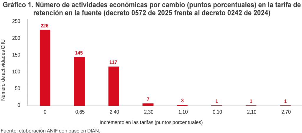 - El decreto plantea un incremento en las tarifas de retención en la fuente por concepto de renta. Las tarifas aumentaron considerablemente respecto a 2024, y los sectores con mayor carga tributaria adicional son los de mayor aporte al crecimiento económico y la ocupación.