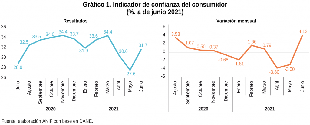 Como era de esperarse, en el mes de junio de 2021, tanto el Indicador de Confianza del Consumidor (ICC) como el Indicador de Confianza empresarial (ICE) mostraron una variación positiva frente al mes anterior, cuando se registró un pesimismo marcado por los hechos ocurridos en el paro nacional. El ICC registró una mejora importante ubicándose en 31.7 frente a 27.6 en mayo 2021. El aumento de 4.1pp es la variación mensual positiva de mayor magnitud desde que inició la encuesta, que en el mes de junio estuvo fundamentada principalmente en las perspectivas hacia el futuro económico tanto del hogar como del país. Por su parte, el ICE, aumentó de 51.6 en mayo a 54 en junio, con una variación positiva de 2.4 pp que se da en todos los sectores, pero principalmente en el sector servicios.