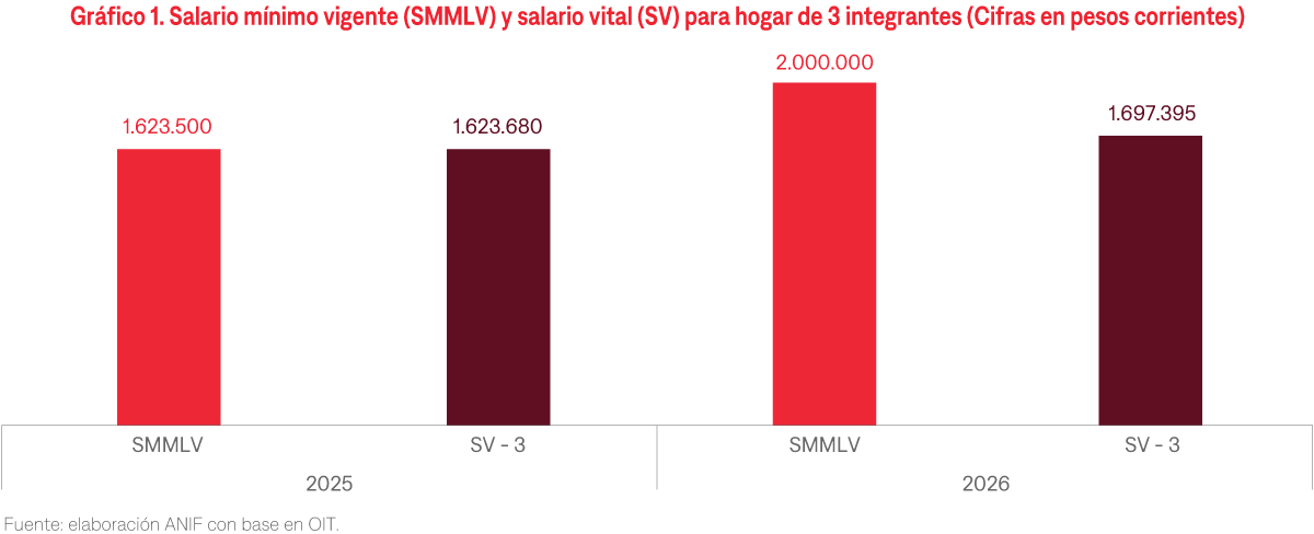 - En ausencia de una cifra actualizada, hacemos una estimación del salario vital para una familia promedio compuesta por tres integrantes y lo comparamos con el salario mínimo decretado por el Gobierno. Encontramos que el salario mínimo para 2026 es 18% superior al salario vital.